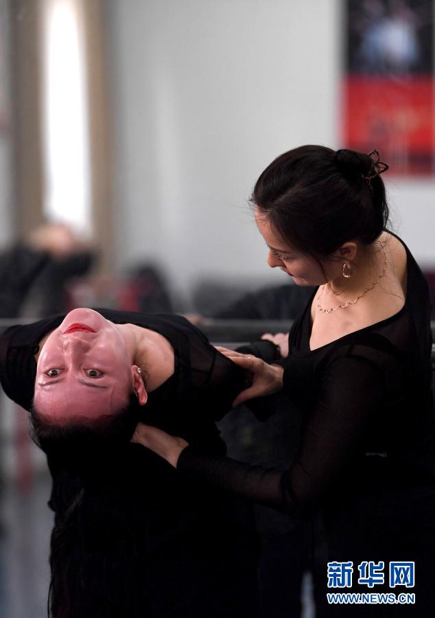 3月4日,在新疆喀什地区歌舞剧团舞蹈队排练厅,阿米娜·玉素甫(右)指导舞蹈队舞者排练。