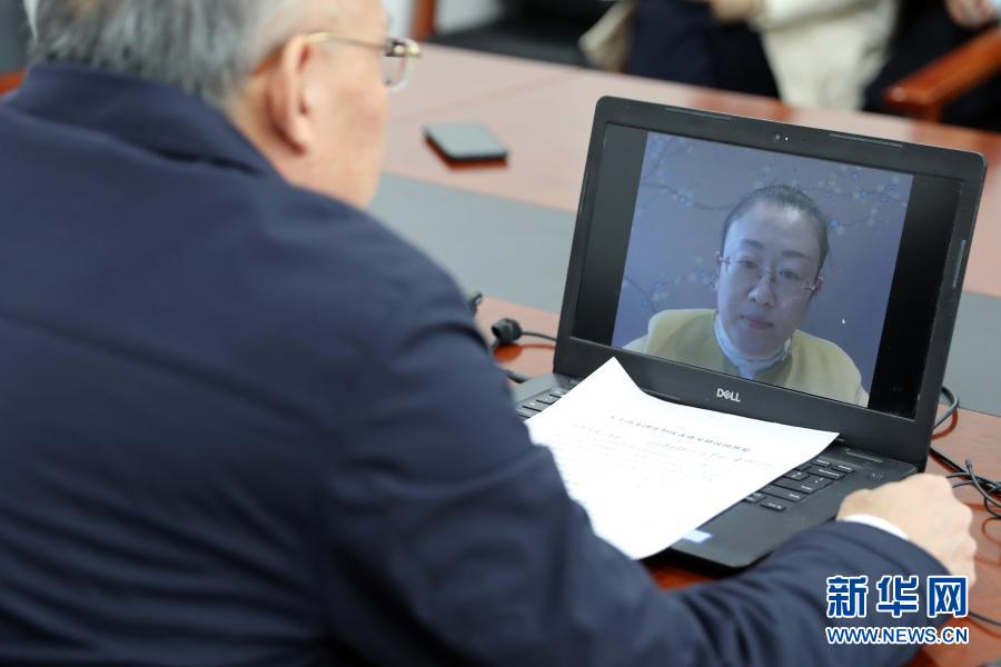 3月7日,全国人大代表、山东省泰安市农科院食用菌研究所所长孔怡(屏幕画面中)同农业农村部种业管理司副司长孙好勤在北京进行网络视频连线。