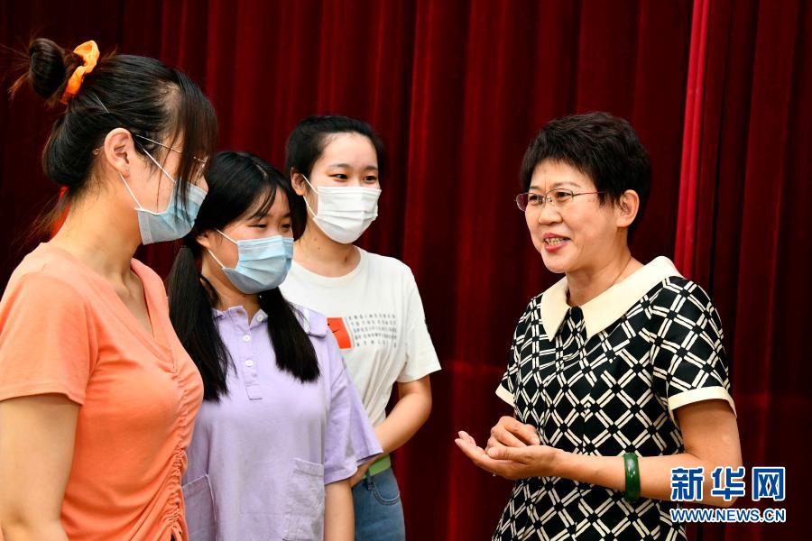 在山东潍坊学院法学院,全国人大代表高明芹(右一)在宣讲《民法典》相关内容(2020年6月16日摄)。新华社记者 郭绪雷摄
