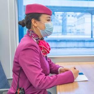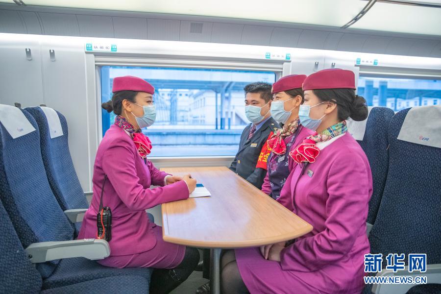 3月7日,在G4367次列车折返站(铜仁站),列车长李馨竹(左)组织班组职工召开值乘小结会。新华社记者 黄伟 摄