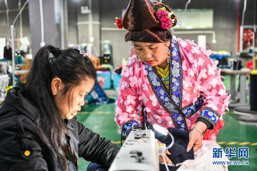 韦祖英(右)在贵州省从江县美娥社区易地扶贫搬迁安置点的刺绣公司里指导工人制作民族服饰(2月25日摄)。新华社记者 杨文斌 摄