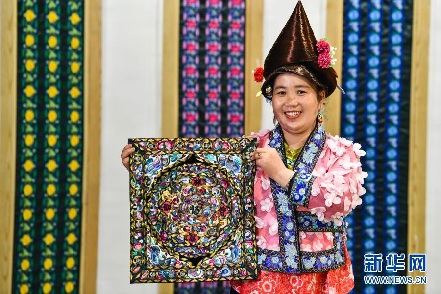 韦祖英在贵州省从江县美娥社区易地扶贫搬迁安置点的刺绣公司里展示民族刺绣(2月25日摄)。新华社记者 杨文斌 摄