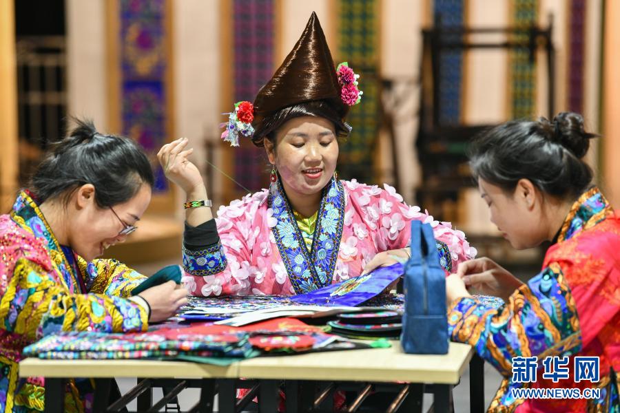 韦祖英(中)在贵州省从江县美娥社区易地扶贫搬迁安置点的刺绣公司里与绣娘们一起刺绣(2月25日摄)。新华社记者 杨文斌 摄