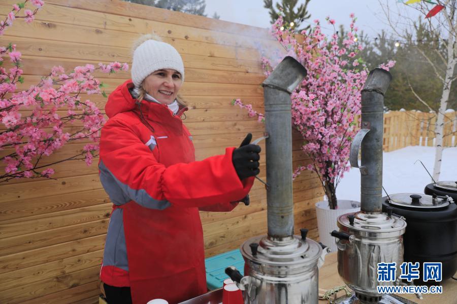 3月7日,一位女士在哈萨克斯坦首都努尔苏丹的中央公园售卖传统俄式茶饮。