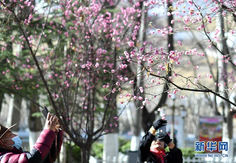 3月4日,人们在拉萨龙王潭公园赏花、拍照。