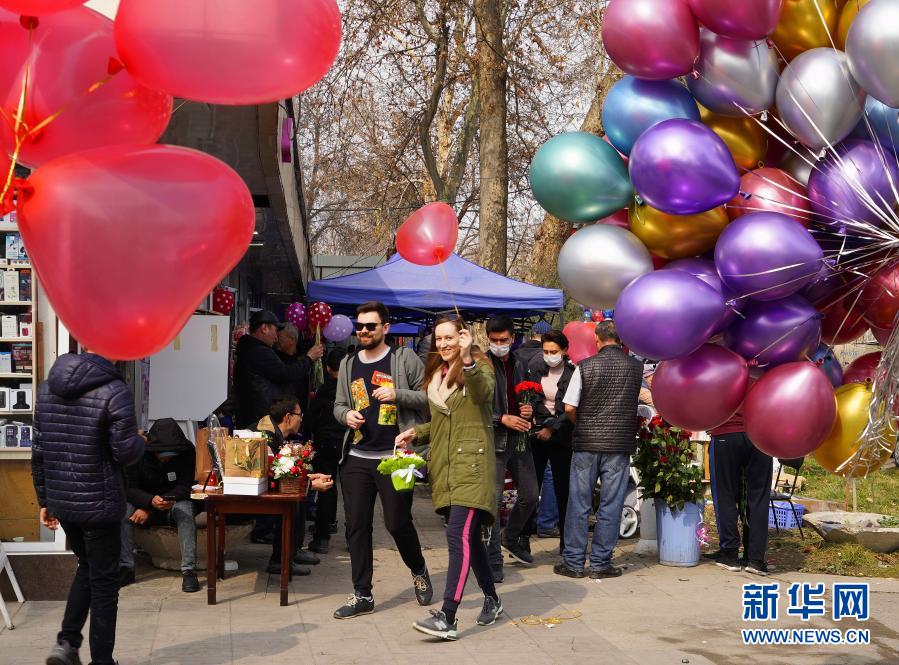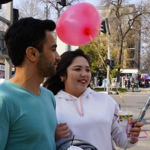 3月8日,一对情侣手持鲜花和气球走在乌兹别克斯坦首都塔什干街上。