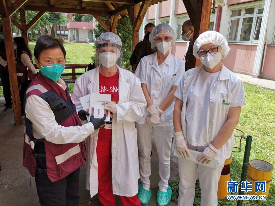 中国赴塞尔维亚医疗专家组成员成守珍(左一)向尼什养老院工作人员赠送有关新冠肺炎防疫与肺康复护理的资料(2020年5月12日摄)。成守珍是抗疫前线的“白衣战士”,带领中山大学附属第一医院130多名队员驰援武汉抗击疫情,抗疫两个月花白头发全变白。武汉归来,短暂休整后,成守珍又加入了中国援助塞尔维亚医疗专家组,在塞尔维亚继续战斗了40天。