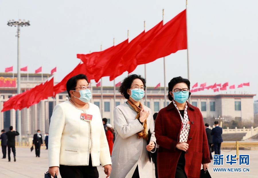 3月8日,十三届全国人大四次会议在北京人民大会堂举行第二次全体会议。这是女代表们走向会场。新华社记者 王南 摄