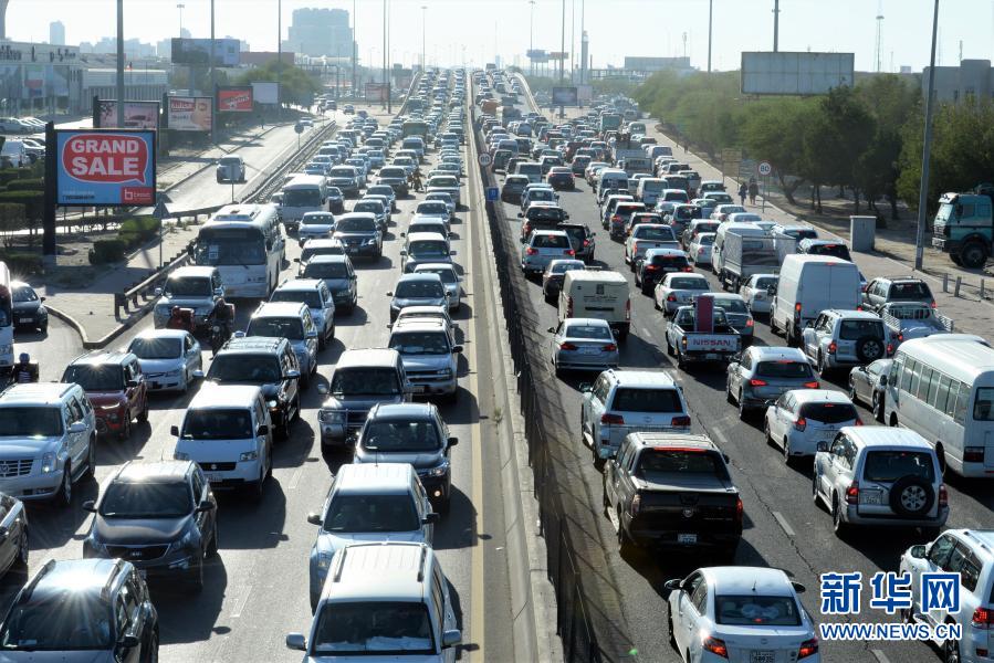 这是3月7日在科威特首都省拍摄的宵禁前拥堵的马路。