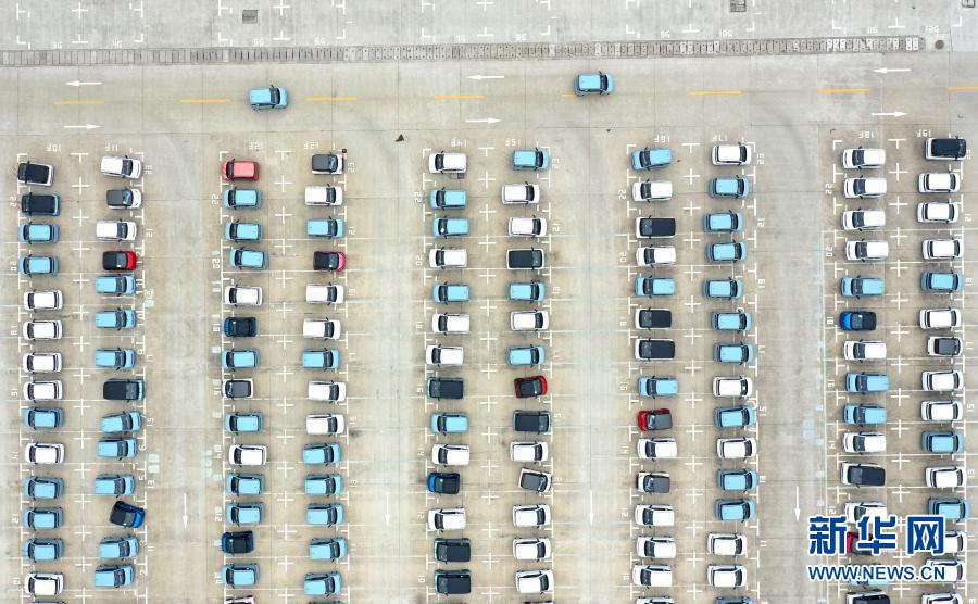 3月8日,在广西柳州一家汽车物流园,工作人员把准备外运的新能源汽车驶出停车场(无人机照片)。