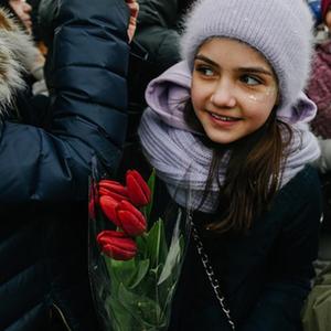 当日,克里姆林宫骑术学校的骑手在国民经济成就展览馆向参观者赠送鲜花,庆祝“三八”国际劳动妇女节。