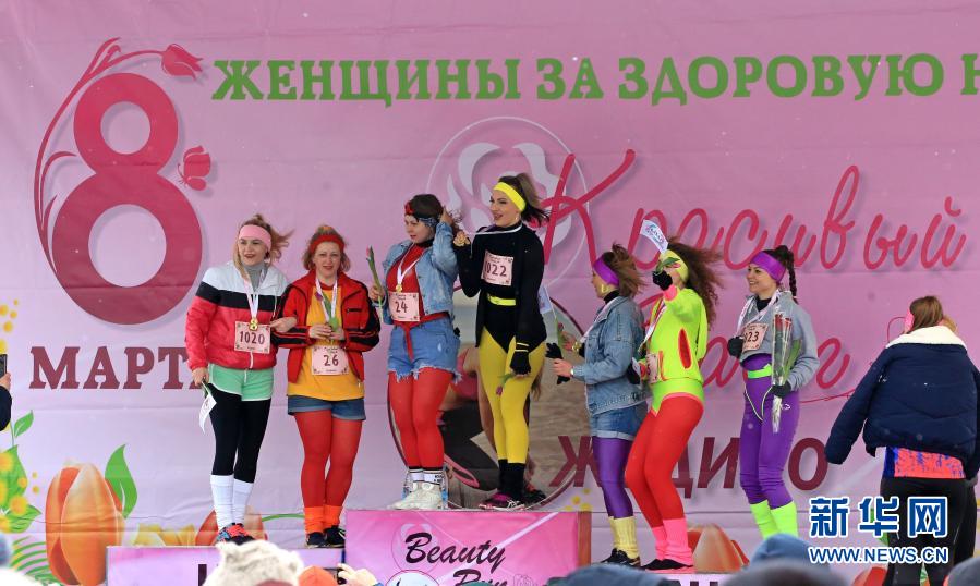 3月8日,“美女赛跑”的优胜者们在白俄罗斯若季诺市颁奖台上合影。