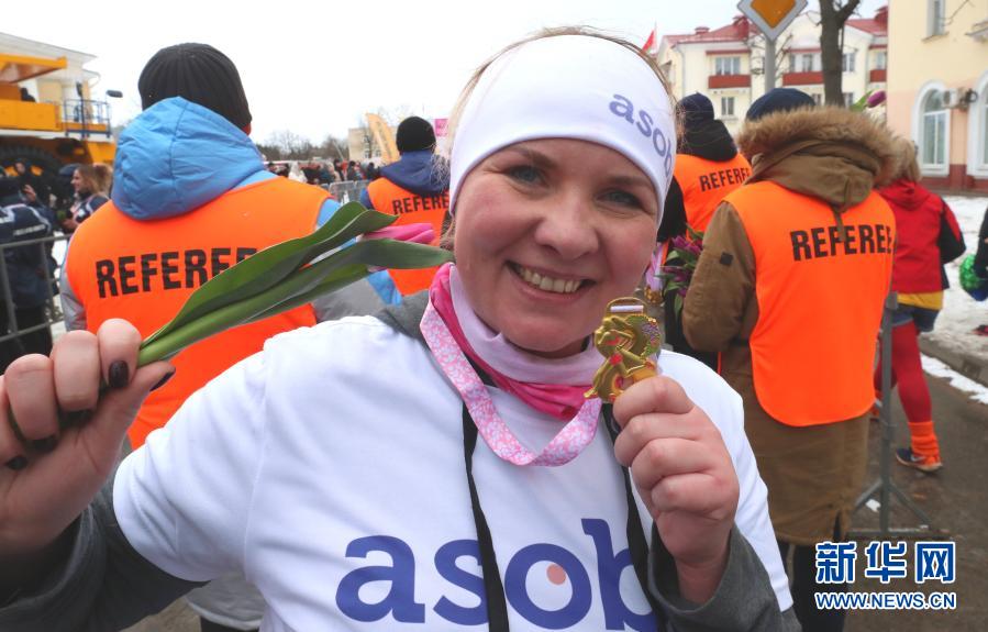 3月8日,一位选手在白俄罗斯若季诺市参加“美女赛跑”后展示自己的纪念奖牌。