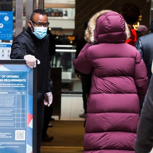 3月8日,在加拿大多伦多,人们进入一家购物中心前排队接受健康状况问询。