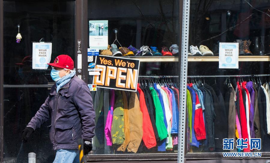 3月8日,在加拿大多伦多,戴口罩的行人从一家营业的店铺前走过。新华社发(邹峥摄)