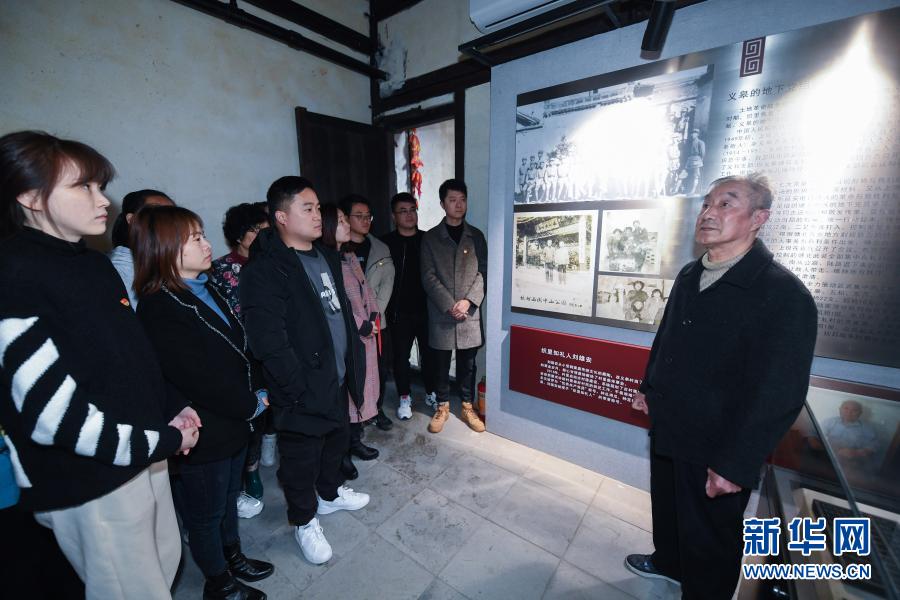 3月9日,在织里镇义皋村的党史馆,76岁的村民宣亚鑫(右一)给年轻党员们介绍当地的革命历史以及老一辈共产党员的事迹。