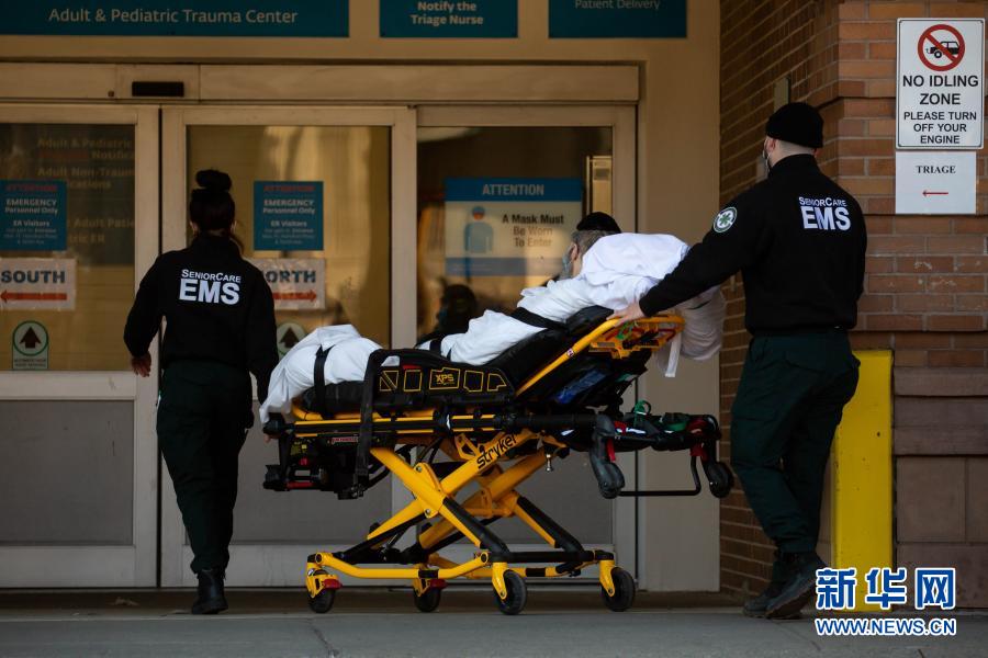 3月8日,美国纽约的医护人员在医院外运送病人。新华社发(郭克摄)