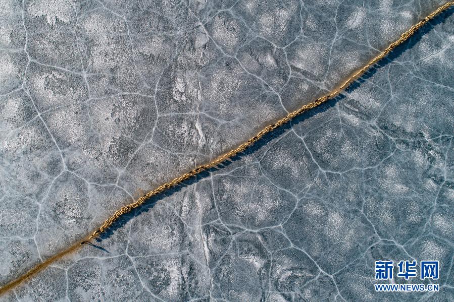 羊群顺着安全小路通过普莫雍错冰湖(3月6日摄,无人机照片)。新华社记者 孙瑞博 摄