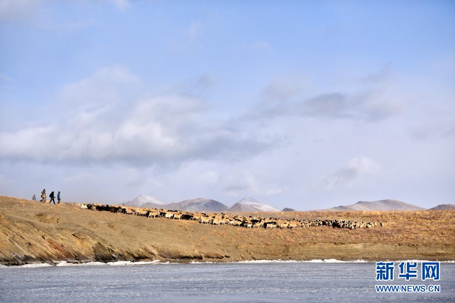 羊群在普莫雍错湖心岛上准备出发(3月6日摄)。新华社记者 孙瑞博 摄