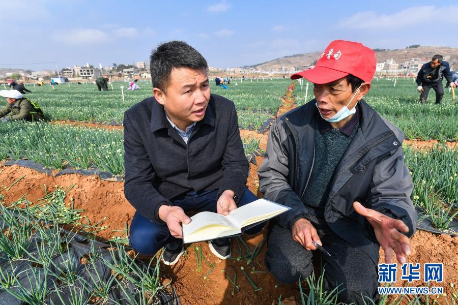 鲁甸易地扶贫搬迁安置区雨露社区党总支书记饶鹏(左)在安置区香葱基地了解登记工分情况(3月5日摄)。