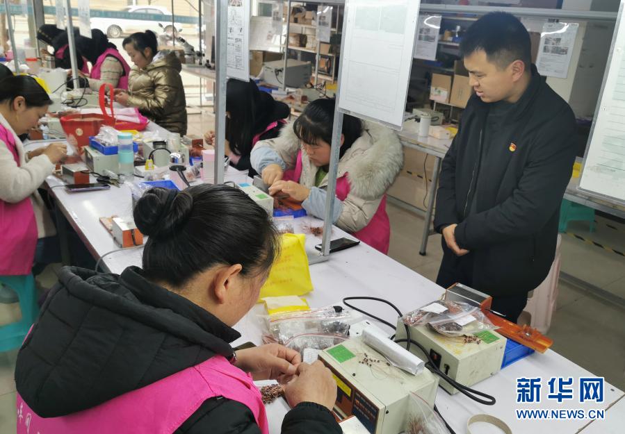 鲁甸易地扶贫搬迁安置区卯家湾社区党总支书记卢正坤(右一)在安置区扶贫车间查看生产情况(3月6日摄)。