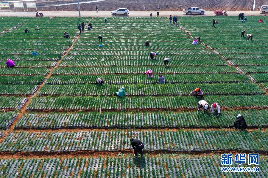 搬迁群众在鲁甸易地扶贫搬迁安置区香葱基地劳作(3月5日摄,无人机照片)。