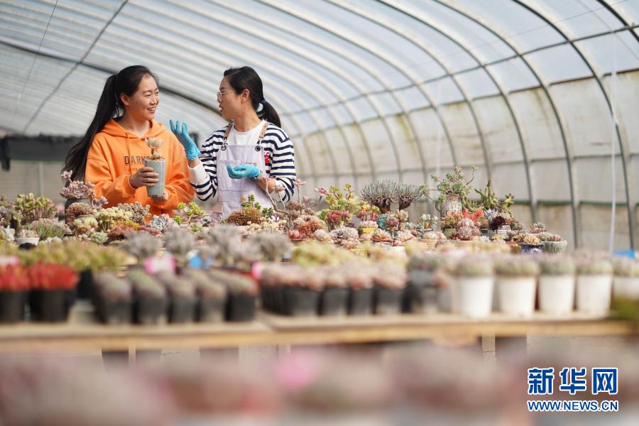 3月9日,在内丘县一家多肉培育基地,员工(右)向游客介绍多肉。近年来,河北省邢台市内丘县加快推进休闲农业和乡村旅游发展,打造“农业+旅游”农旅融合新业态,逐步形成“农旅结合、以农促旅、以旅兴农”的产业格局,带动群众增收致富,助推乡村振兴。新华社发(刘继东 摄)