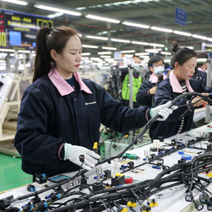 3月9日,在安徽淮北高新技术产业开发区,工人在汽车线束生产线上忙碌。新华社发(万善朝 摄)