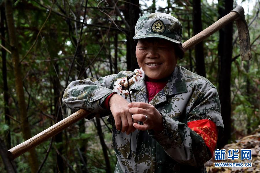 3月9日,在瓦上管护站林区内,黄淑萍在巡山护林时摘了几朵野樱花。