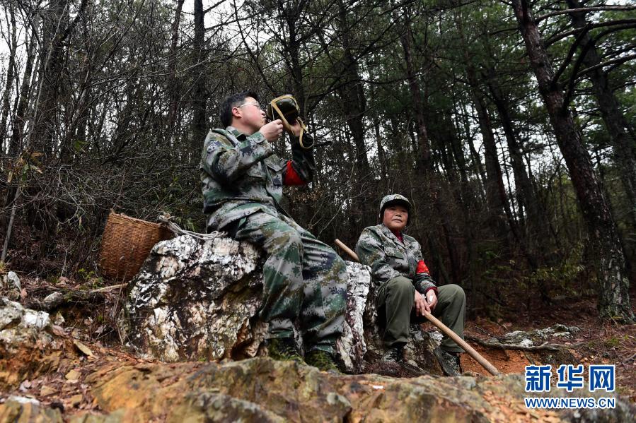 3月9日,在瓦上管护站林区内,洪晓春(左)和黄淑萍在巡山护林途中休息。