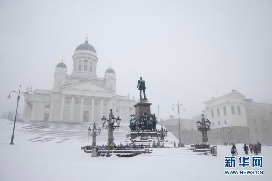 芬兰首都赫尔辛基9日遭遇风雪天气。