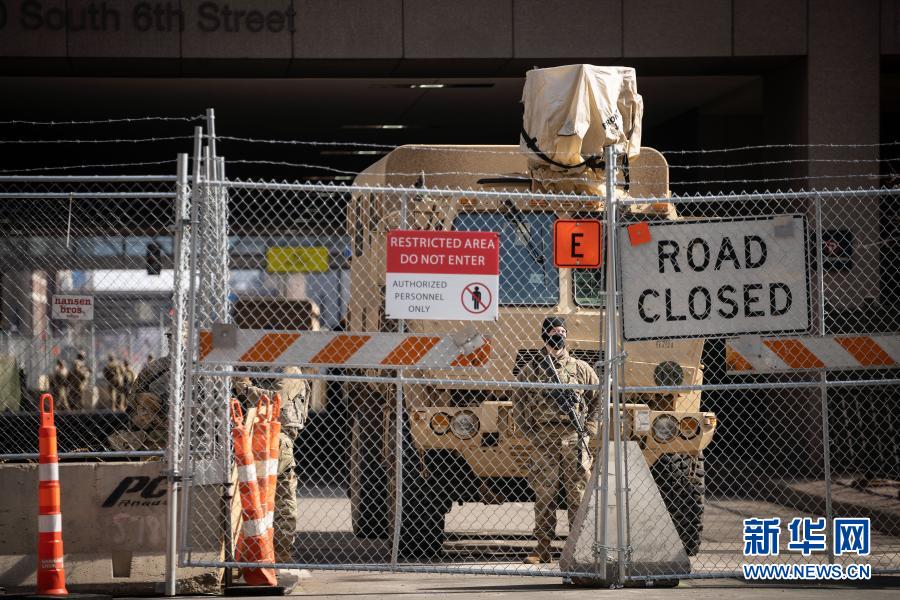 3月9日,在美国明尼苏达州亨内平县负责审理弗洛伊德案的法院周围,国民警卫队封锁道路严阵以待。