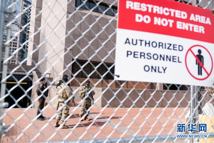 3月9日,在美国明尼苏达州亨内平县负责审理弗洛伊德案的法院周围,国民警卫队封锁道路严阵以待。