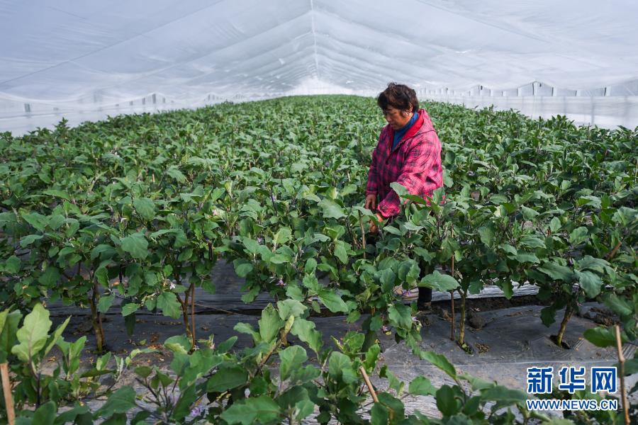 3月10日,在嘉善县姚庄镇现代农业小微产业园的大棚内,农民在查看茄子长势。该产业园引入第三方管理,服务本地及周边小微农户、合作社、青年创业者等群体。目前,产业园有大棚面积约900亩,形成了以茄子种植为主的种植模式,产品主要销往长三角地区。