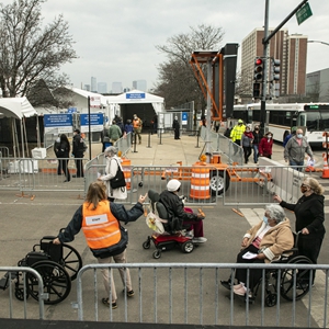 3月10日,在美国芝加哥,人们准备进入联合中心球场新冠疫苗接种点。位于芝加哥联合中心球场的一处新冠疫苗接种点于9日起投入使用。新华社发(乔尔·莱纳摄)