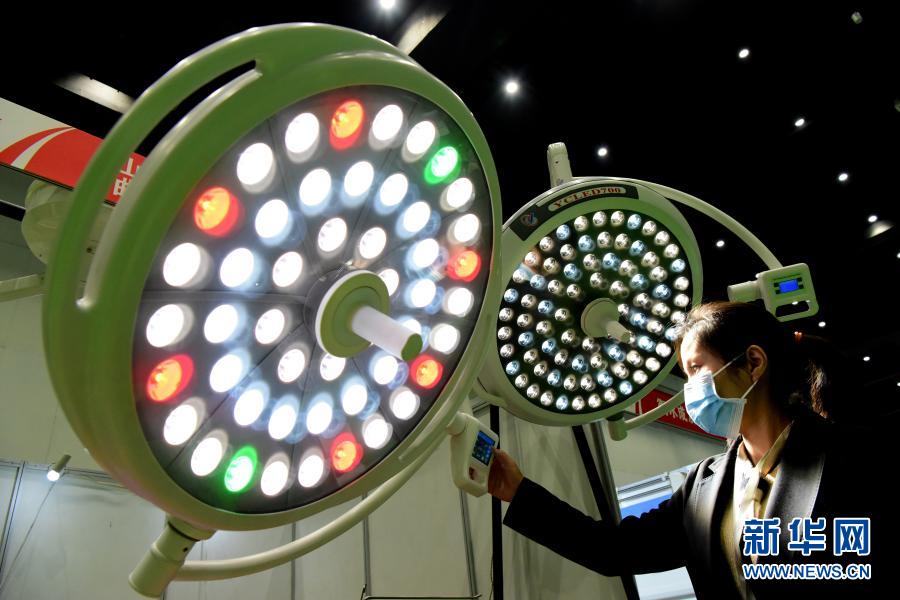 3月11日,工作人员在中原医疗器械展览会上调试一款医疗设备。