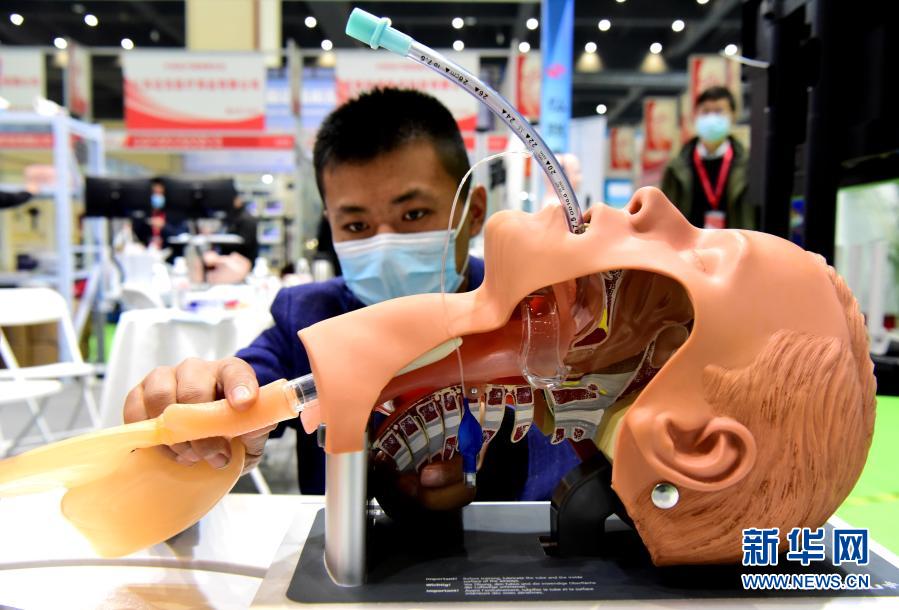 3月11日,工作人员在中原医疗器械展览会上展示一款医疗器械。