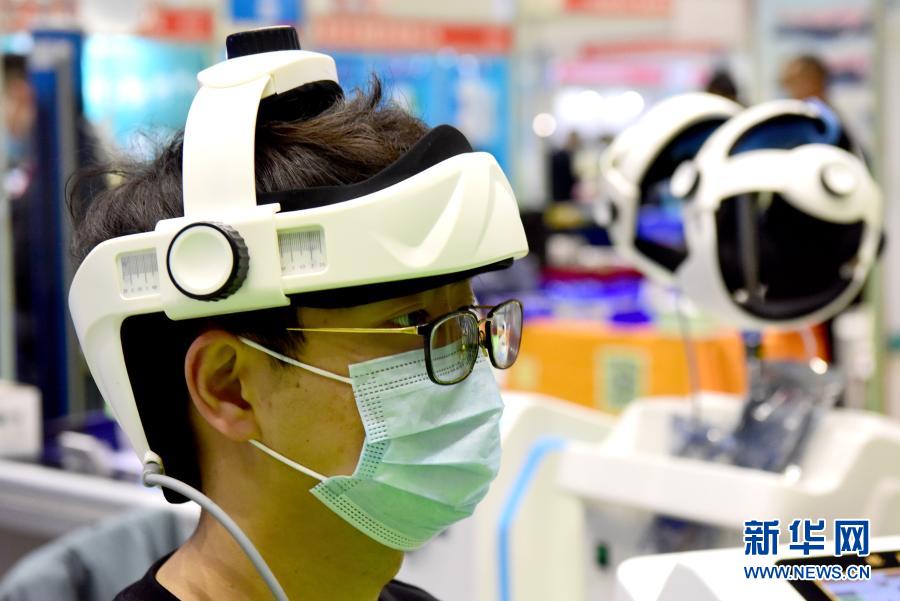 3月11日,参观者在中原医疗器械展览会上体验一款治疗仪。