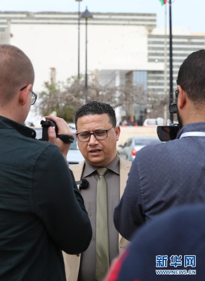 3月10日,利比亚国民代表大会发言人阿卜杜拉·巴尔希格(中)在利中部城市苏尔特接受采访。
