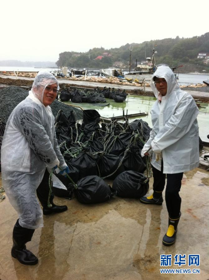 2011年,中国留学生龚雷(右)和吕学龙冒雨帮当地民众清理赈灾垃圾。
