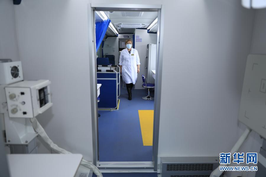 3月10日,医护人员在哈萨克斯坦阿克莫州地方医院的移动医疗车上走向X光机分区。新华社发(奥斯潘诺夫摄)