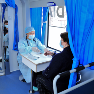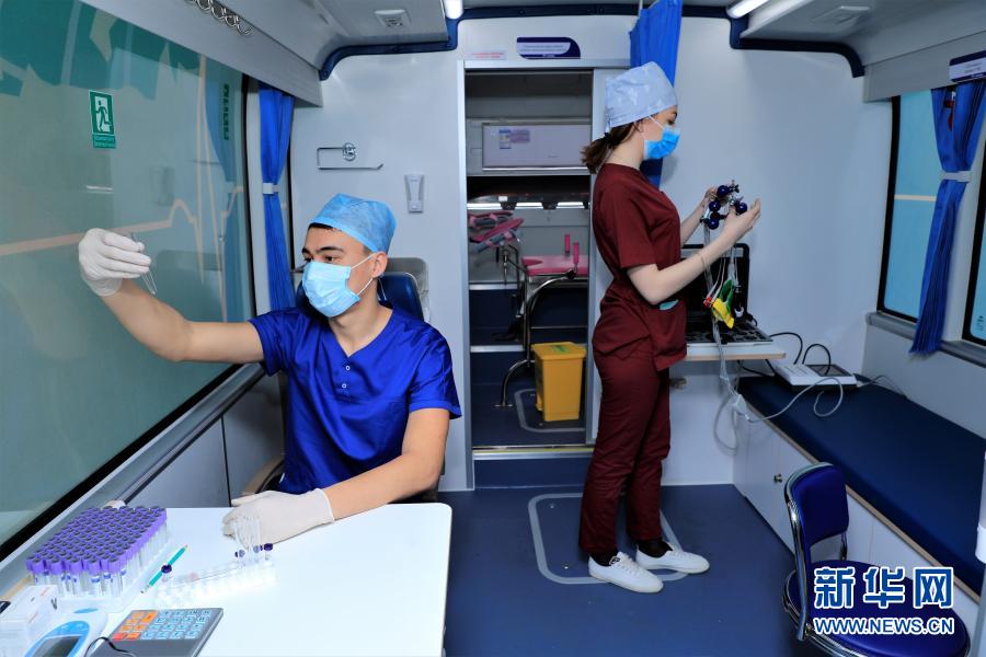 3月10日,医疗工作者在哈萨克斯坦阿克莫州地方医院的移动医疗车上检测调试设备。新华社发(奥斯潘诺夫摄)