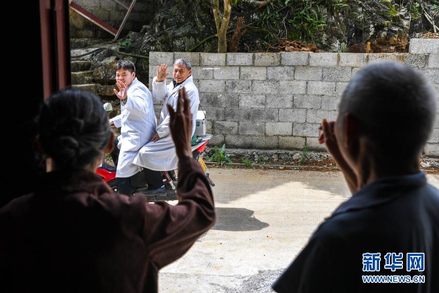 3月11日,在那坡县平孟镇弄汤村,出诊结束后,赵建华(后右)、赵刚与村民挥手告别。