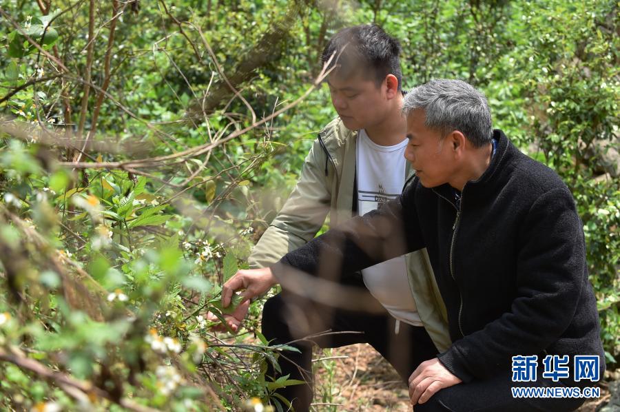 3月11日,在那坡县平孟镇弄汤村,赵建华(右)与赵刚在山坡上辨认草药。