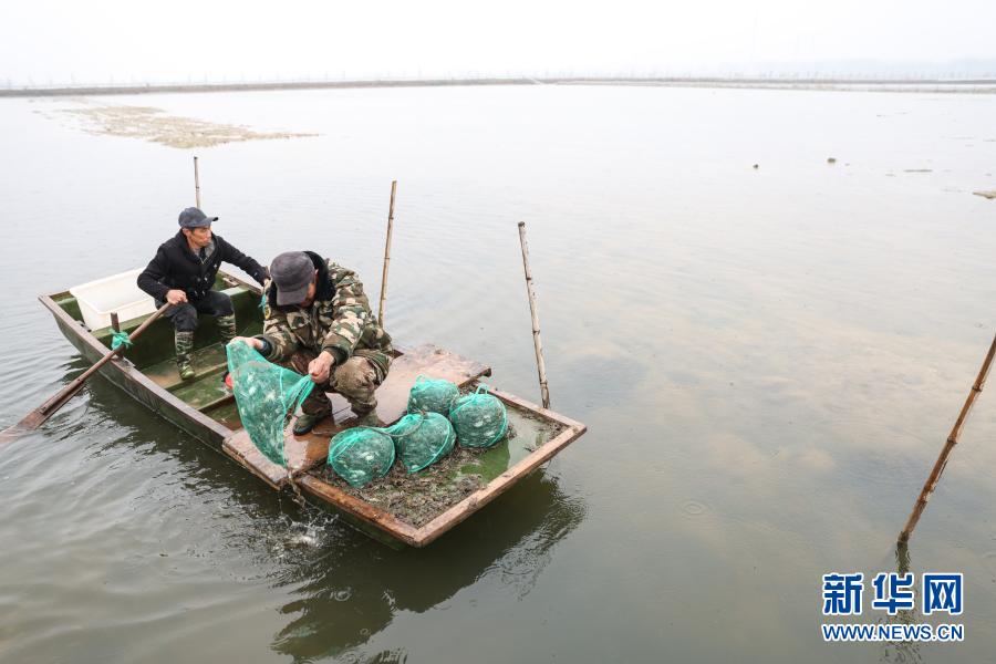 3月11日,蟹农闫家强(右)在投放蟹苗。