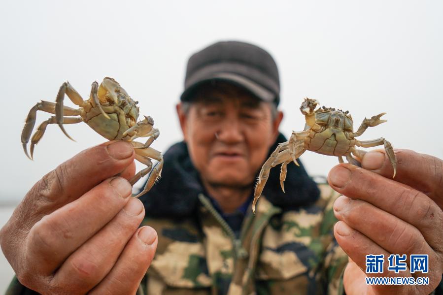 3月11日,蟹农闫家强展示即将投放的蟹苗。
