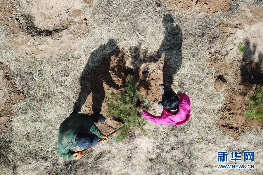 3月11日,在平凉市崆峒区白水镇焦庄村北山,张文玉(右)现场指导工人种植油松(无人机照片)。