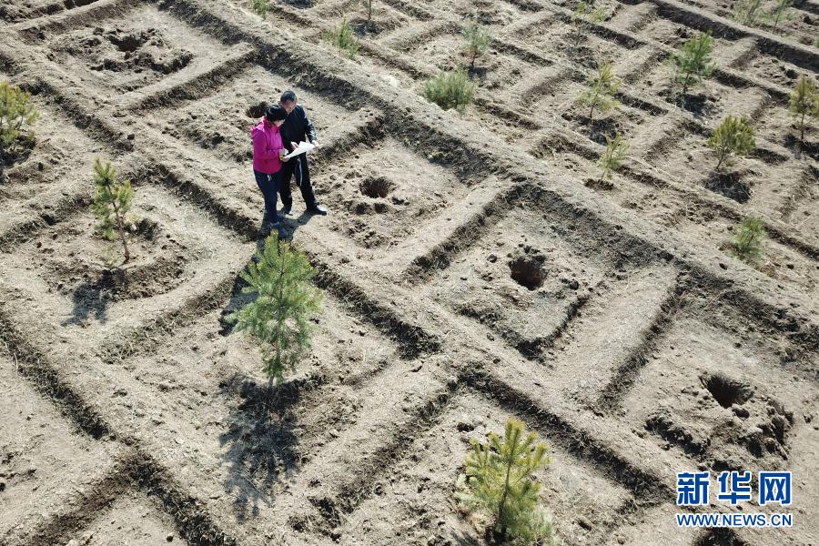 3月11日,在平凉市崆峒区白水镇焦庄村北山,张文玉(左)和同事讨论植树造林细节(无人机照片)。