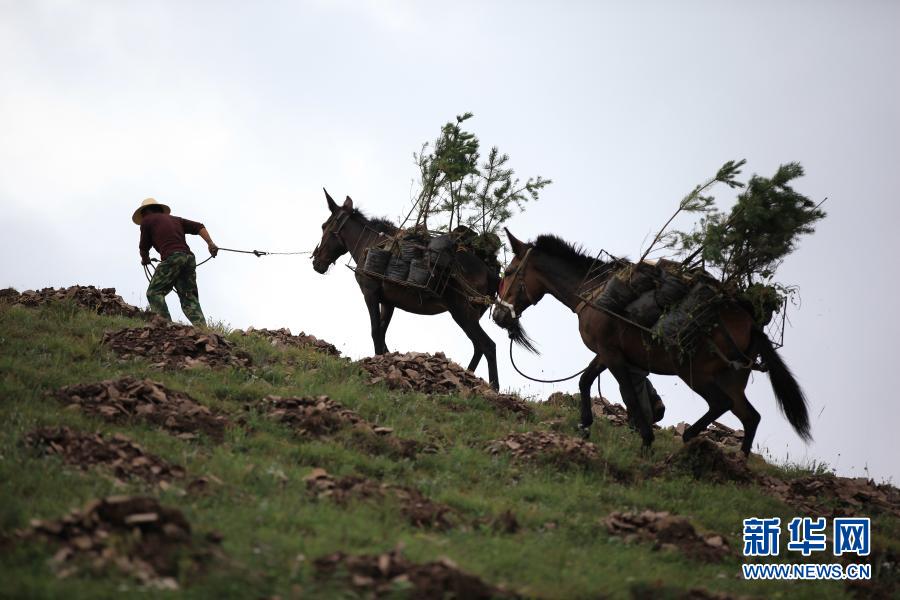 在河北省丰宁满族自治县千松坝林场,造林队员利用骡队运送树苗(2018年8月7日摄)。
