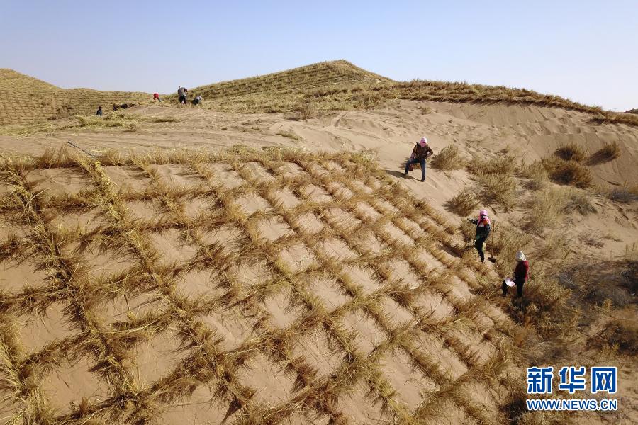 在甘肃省古浪县北部沙区旱麻岗治沙点,八步沙林场治沙人和群众一起扎草方格压沙(2020年3月6日摄,无人机照片)。